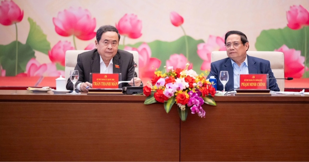 Chiều nay, 9/3, tại Nhà Quốc hội, Ủy viên Bộ Chính trị, Bí thư Đảng ủy Quốc hội, Chủ tịch Quốc hội Trần Thanh Mẫn và Bí thư Đảng ủy Chính phủ, Thủ...
