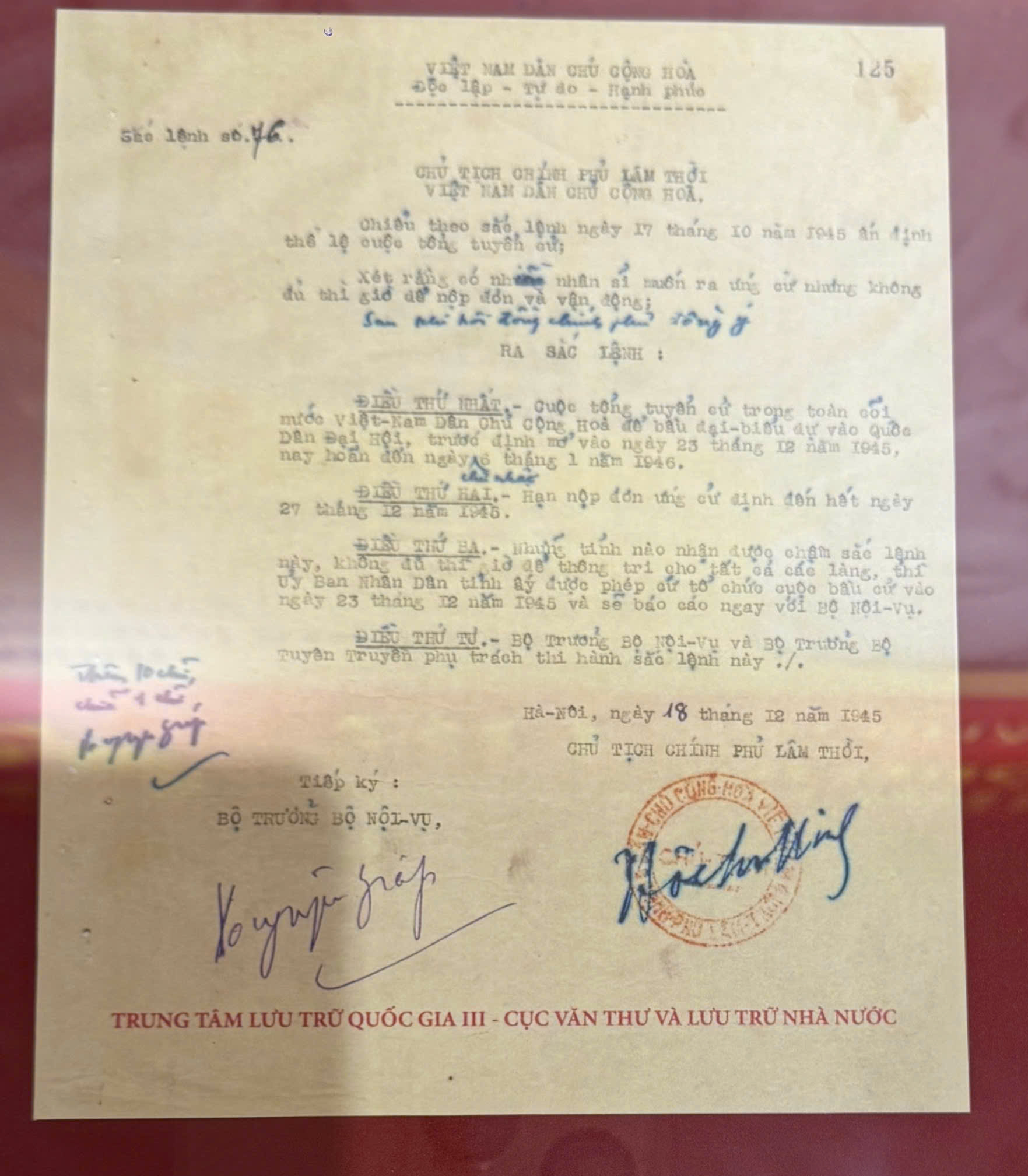 Sắc lệnh 76 của Chủ tịch Hồ Chí Minh quy định về ngày Tổng tuyển cử 6-1-1946 - Ảnh: Phương Lan