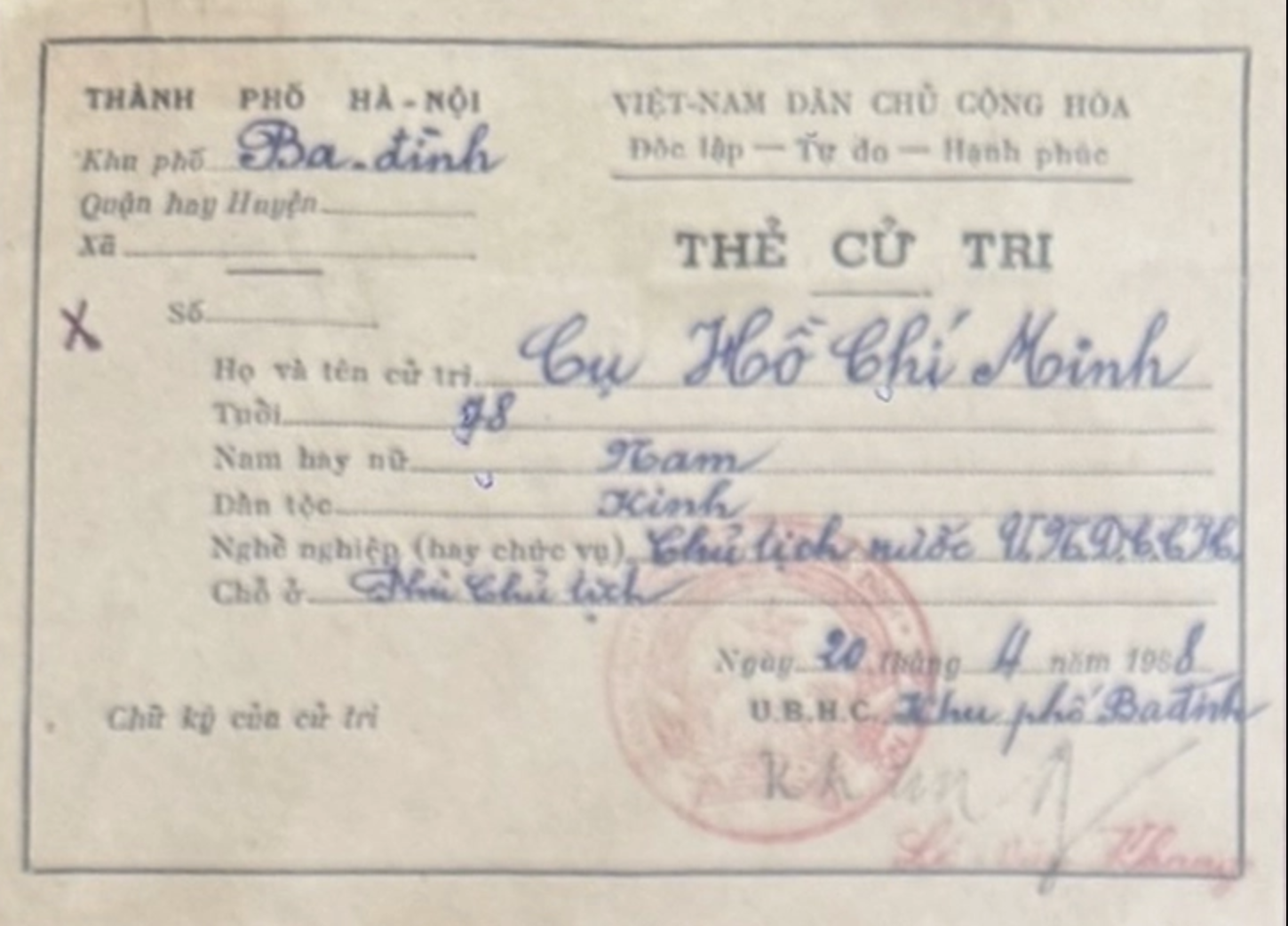 Đặc biệt, thẻ cử tri của Chủ tịch Hồ Chí Minh năm 1968 gây xúc động cho người xem khi trên tấm thẻ ấy, phần Họ và tên cử tri ghi "Cụ Hồ Chí Minh". Đó là thẻ cử tri cuối cùng của Bác để tham gia bầu cử đại biểu Hội đồng nhân dân thành phố Hà Nội, khóa IV trước khi Người qua đời 1 năm sau.