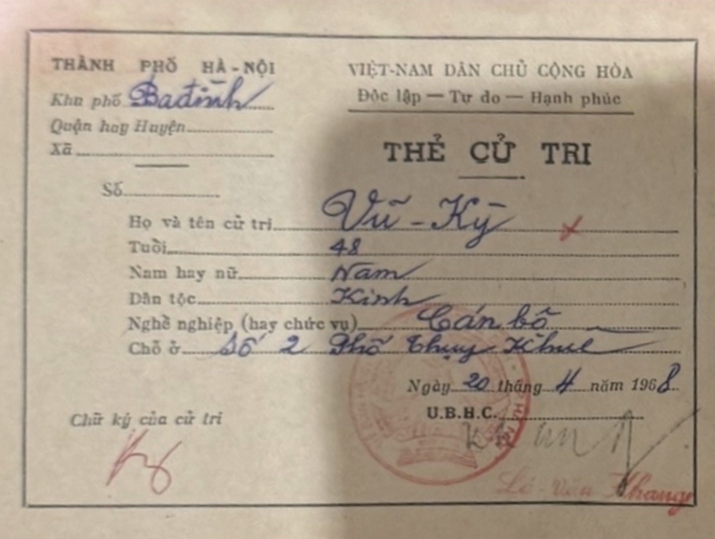 Bên cạnh thẻ cử tri của Chủ tịch Hồ Chí Minh là thẻ cử tri của ông Vũ Kỳ - thư ký Bác Hồ, cũng trong kỳ bầu cử năm 1968.