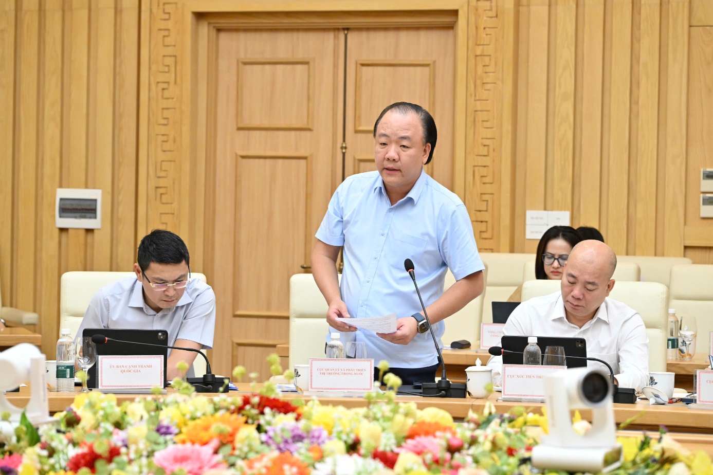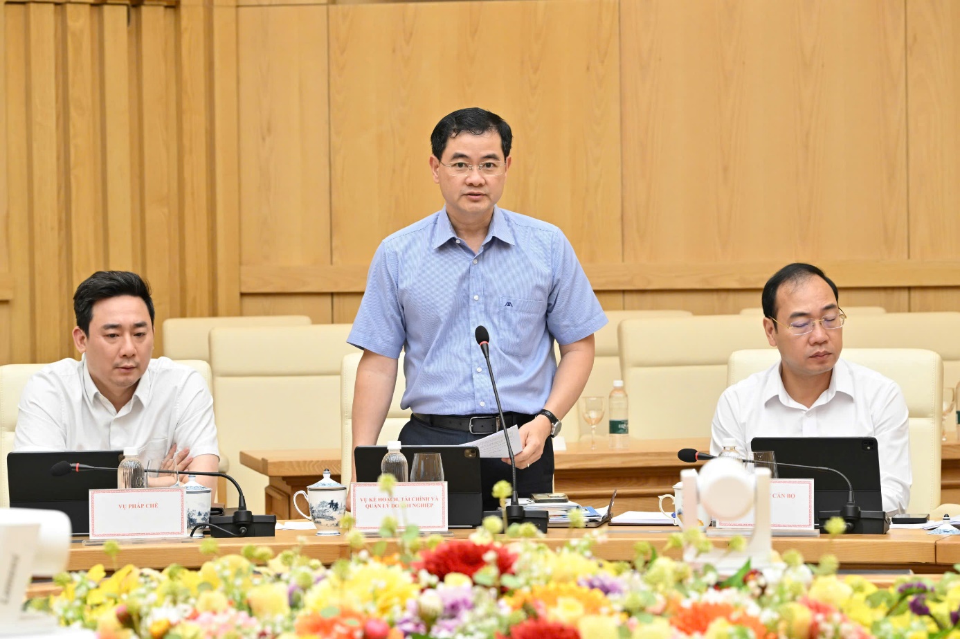 Vụ trưởng Vụ Kế hoạch, Tài chính và Quản lý doanh nghiệp Bùi Huy Sơn trình bày báo cáo tại Hội nghị