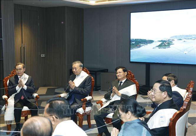 Tối 5/2, tại Thủ đô Vientiane, Tổng Bí thư Tô Lâm cùng các đồng chí lãnh đạo Đảng, Nhà nước Việt Nam dự Lễ buộc chỉ cổ tay truyền thống của Lào do Tổng Bí thư, Chủ tịch nước Lào Thongloun Sisoulith chủ trì - Ảnh: TTXVN