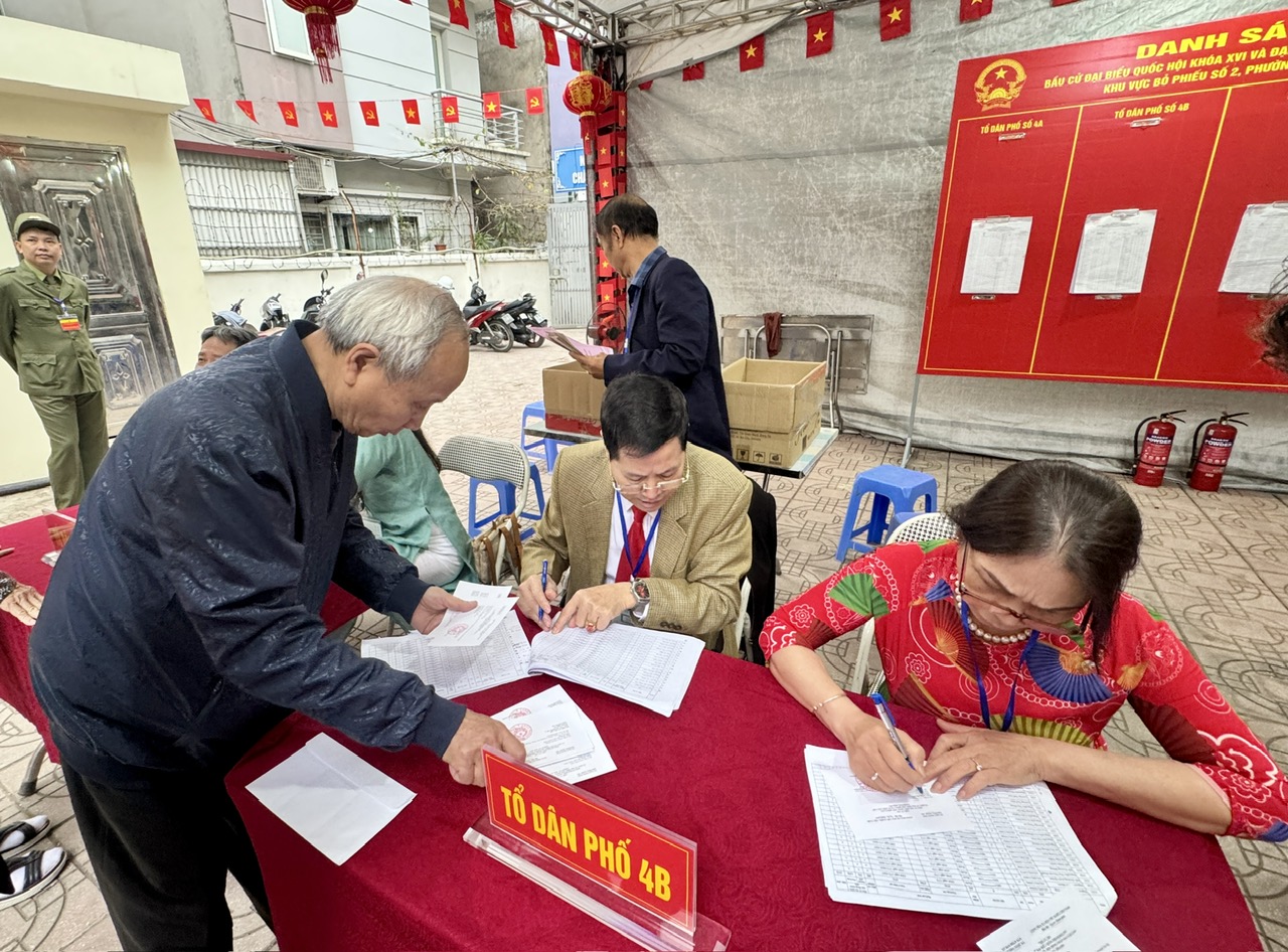 Từ sáng sớm, không khí ngày bầu cử tại khu vực bỏ phiếu số 2, phường Ngọc Hà, TP. Hà Nội diễn ra rộn ràng, trang trọng và đầy phấn khởi. Khu vực bỏ phiếu được trang hoàng rực rỡ với cờ đỏ sao vàng, băng rôn và khẩu hiệu chào mừng ngày hội lớn của toàn dân. Người dân trong khu phố, từ các cụ cao tuổi đến những cử tri trẻ tuổi, đều háo hức đến điểm bỏ phiếu với tinh thần trách nhiệm và niềm tự hào của người công dân.