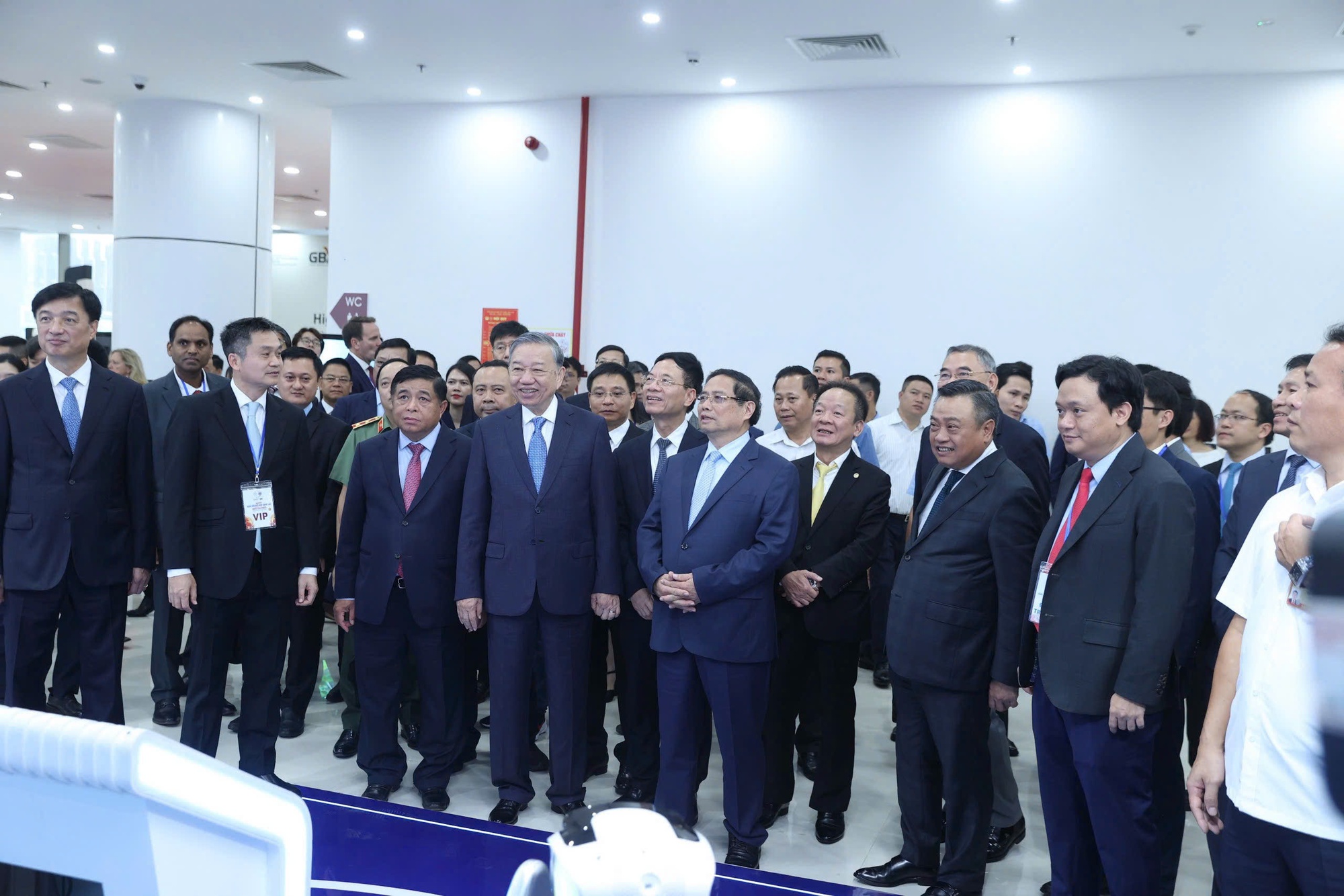 Tổng Bí thư Tô Lâm, Thủ tướng Phạm Minh Chính, Phó Thủ tướng Nguyễn Chí Dũng và các đại biểu tham quan Triển lãm Đổi mới sáng tạo - Ảnh: VGP