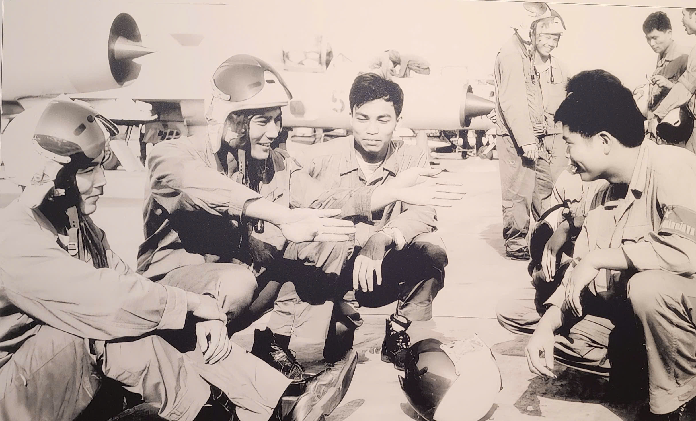 Bức ảnh chụp khoảnh khắc các phi công Việt Nam đang ngồi lại với nhau giữa hai trận đánh, cười nói vui vẻ.