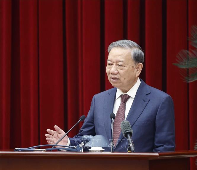 Tổng Bí thư Tô Lâm nêu rõ, thời gian tới, yêu cầu đặt ra là phải tiếp tục nâng cao năng lực lãnh đạo, năng lực cầm quyền và sức chiến đấu của Đảng - Ảnh: TTXVN