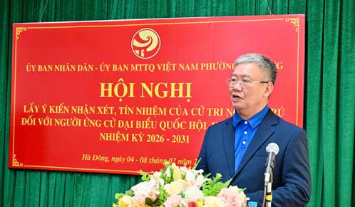 Chiều 6/2, Ủy ban Nhân dân - Ủy ban Mặt trận Tổ quốc Việt Nam phường Hà Đông, TP.Hà Nội tổ chức Hội nghị lấy ý kiến nhận xét và tín nhiệm của cử tri nơi cư trú đối với người được giới thiệu ứng cử đại biểu Quốc hội khóa XVI, Hội đồng Nhân dân các cấp nhiệm kỳ 2026 - 2031. Đồng chí Lê Mạnh Hùng - Ủy viên Trung ương Đảng, Bí thư Đảng ủy, Quyền Bộ trưởng Bộ Công Thương được 100% cử tri dự Hội nghị biểu quyết nhất trí giới thiệu ứng cử đại biểu Quốc hội khóa XVI.